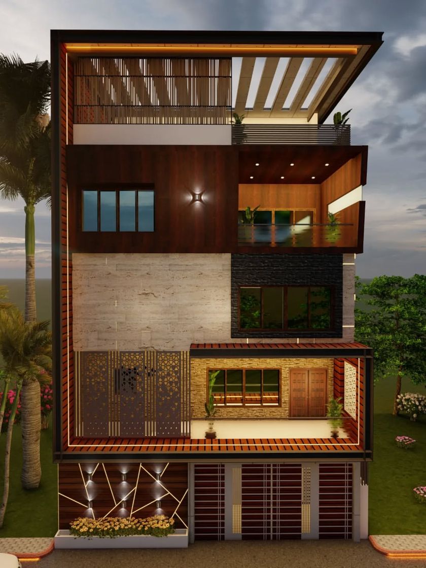 We specialize in creating striking 3D elevation designs that serve as the blueprint for your dream home. Our designs focus on modern aesthetics, using a mix of materials like wood paneling, stone cladding, and exposed concrete, all enhanced by strategic lighting for impressive day and night views.