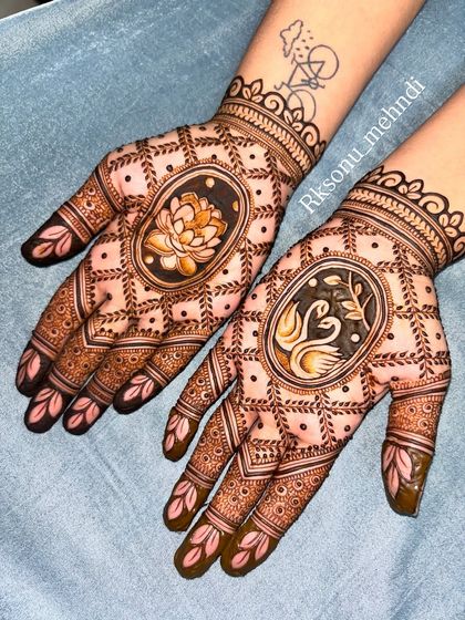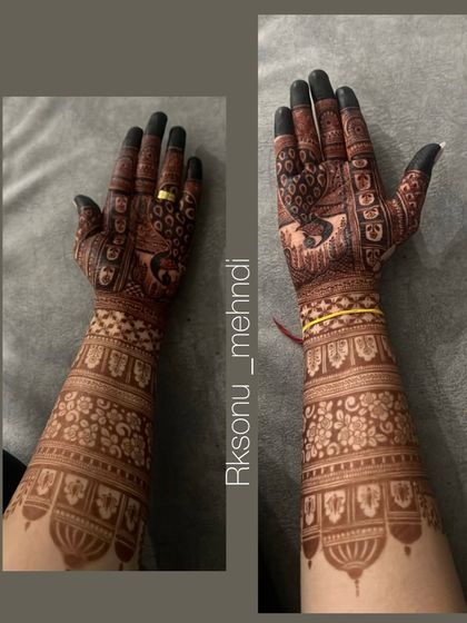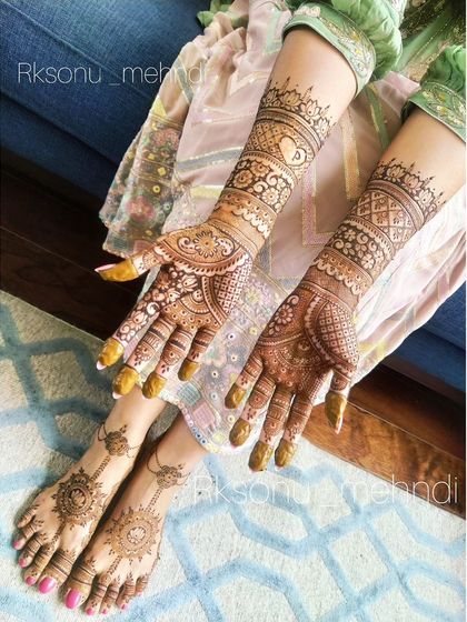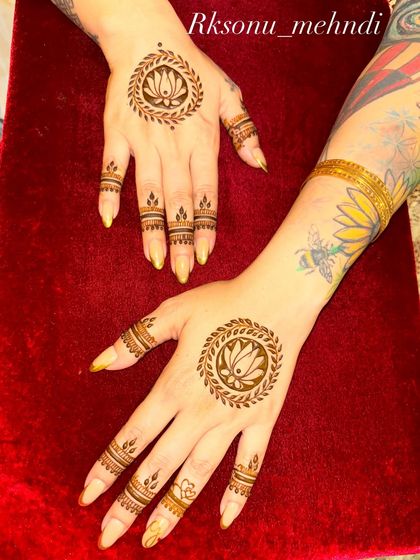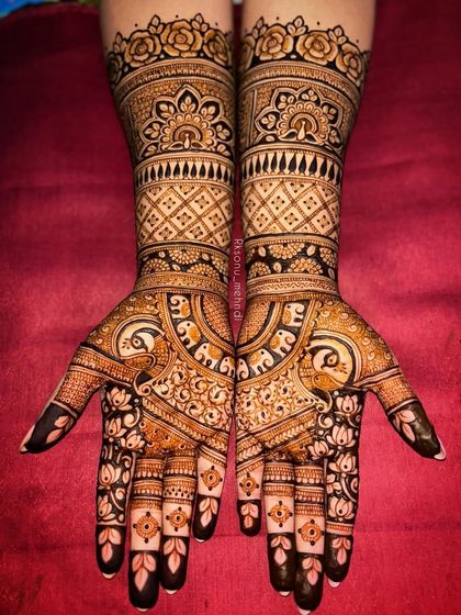 A bridal mehndi specialist, I craft bespoke, intricate designs with my own herbal paste and a 100% color guarantee. My work ranges from detailed bridal portraits to elegant minimalist patterns.