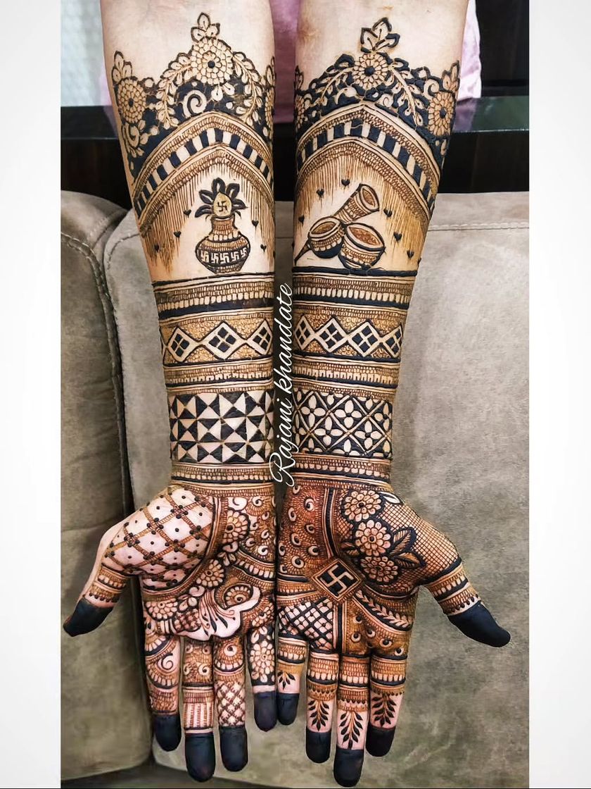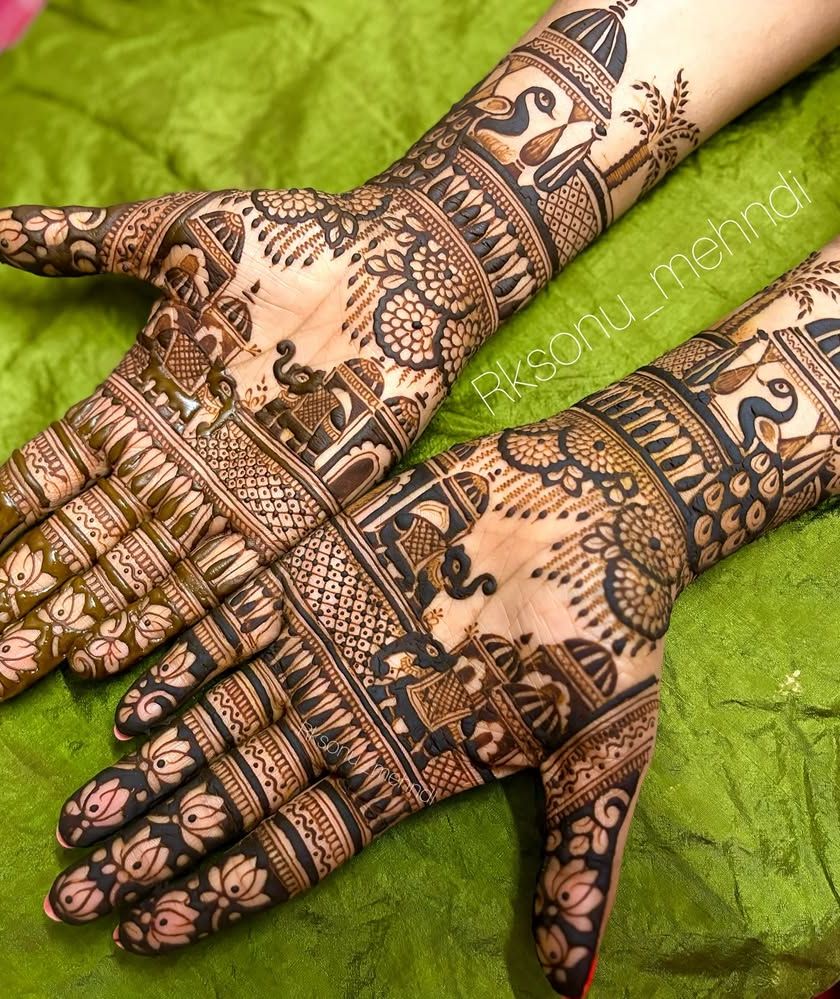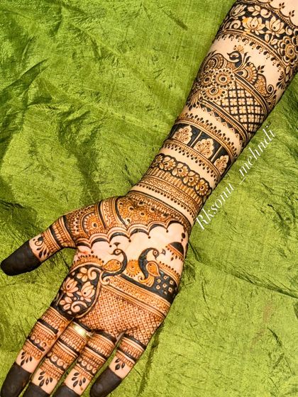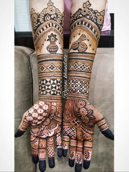 For the bride who dreams of classic, full-coverage mehndi. I create dense, detailed patterns that extend up the arms, filled with timeless motifs like peacocks, elephants, florals, and paisleys. Each design is an exquisite masterpiece, crafted to make you feel like royalty on your wedding day.