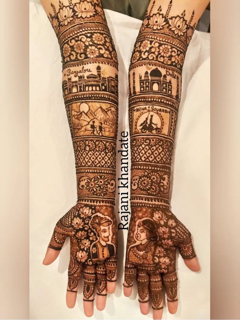 Your wedding mehndi should be as unique as your love story. In this collection, you will see how I translate personal journeys into wearable art. I specialize in drawing couple portraits, recreating wedding rituals like the jaimala, and illustrating scenes that are meaningful to you, all framed by exquisite traditional patterns.