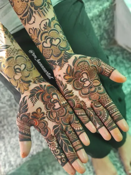 Me? I’m RM, Mumbai ki mehendi wali (Mumbai’s henna artist). Honestly, henna is my happy place – I even do my own hands just for fun. Being a FUFU to my niece, I get to try new designs on family, students, brides, whoever’s around. That moment when the stain matures… wah, Alhamdulillah, feels amazing. No filter, just pure joy. Mashaallah, I live for that deep, rich colour.