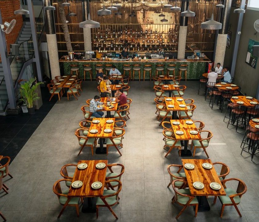 This gallery showcases our completed 7500 sq ft restobar project in Hebbal, Bengaluru. We transformed a large bare shell into a dynamic space by blending industrial aesthetics with warm, rustic accents, focusing on custom features like a grand green bar, a terracotta jaali wall, and layered lighting for a versatile day-to-night ambiance.