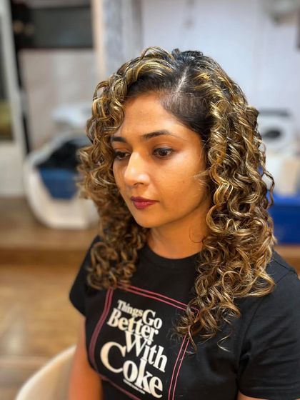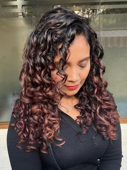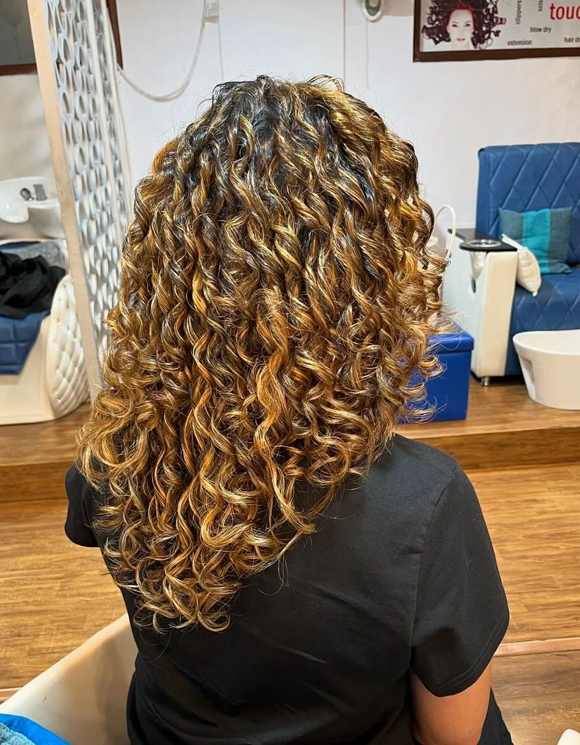 I specialize in Pintura, a technique where I hand-paint color onto each curl individually. This method enhances your natural curl pattern for incredible definition and volume, without the risk of damage that traditional foils can cause.