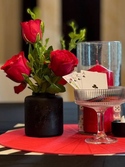 - Thematic Centerpieces: Styling for up to 15 cocktail/dinner tables. Includes mirror bases, fresh floral bunches (Roses/Carnations), and theme-specific props (e.g., miniature dice, feathers, or pearls inside glass vases).