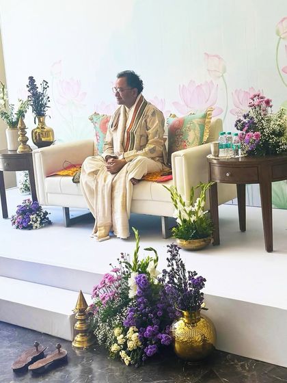 - Stage Decor: Minimalist styling for the MC/Performance stage, including velvet draping and two large floral pedestal arrangements.