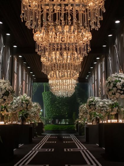 For high-energy celebrations, I design dramatic, black-tie worthy spaces. This style features bold lighting, crystal chandeliers, mirrored surfaces, and lush floral installations to create an atmosphere of pure opulence and modern luxury for your sangeet or cocktail party.