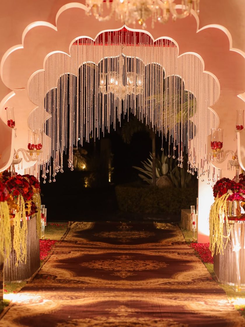 I love making a dramatic first impression that sets the tone for the entire celebration. Here you can see a range of grand entrance designs and large-scale structures, from royal red floral arches and majestic mandaps to modern light tunnels that create a 'wow' factor.
