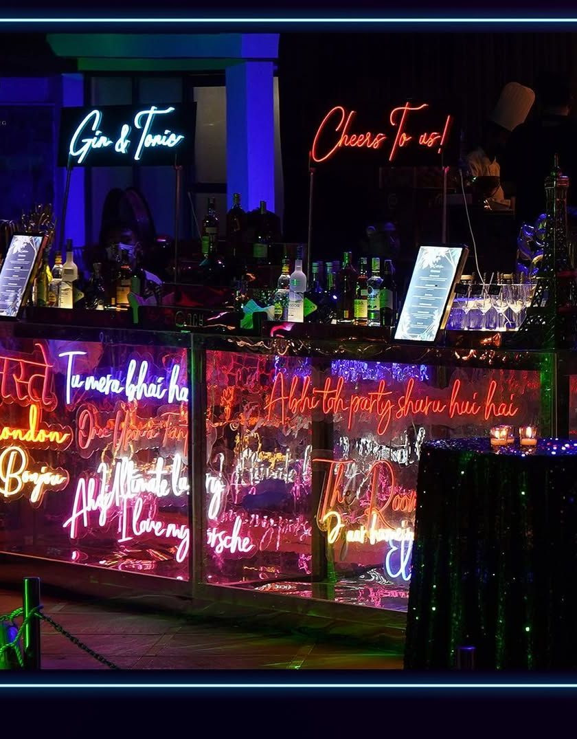 For after-parties or a high-energy sangeet, I design with a bold, modern aesthetic. This includes custom neon signs, vibrant lighting installations, and unique decor elements like illuminated mannequins to create a party atmosphere that is truly electric.