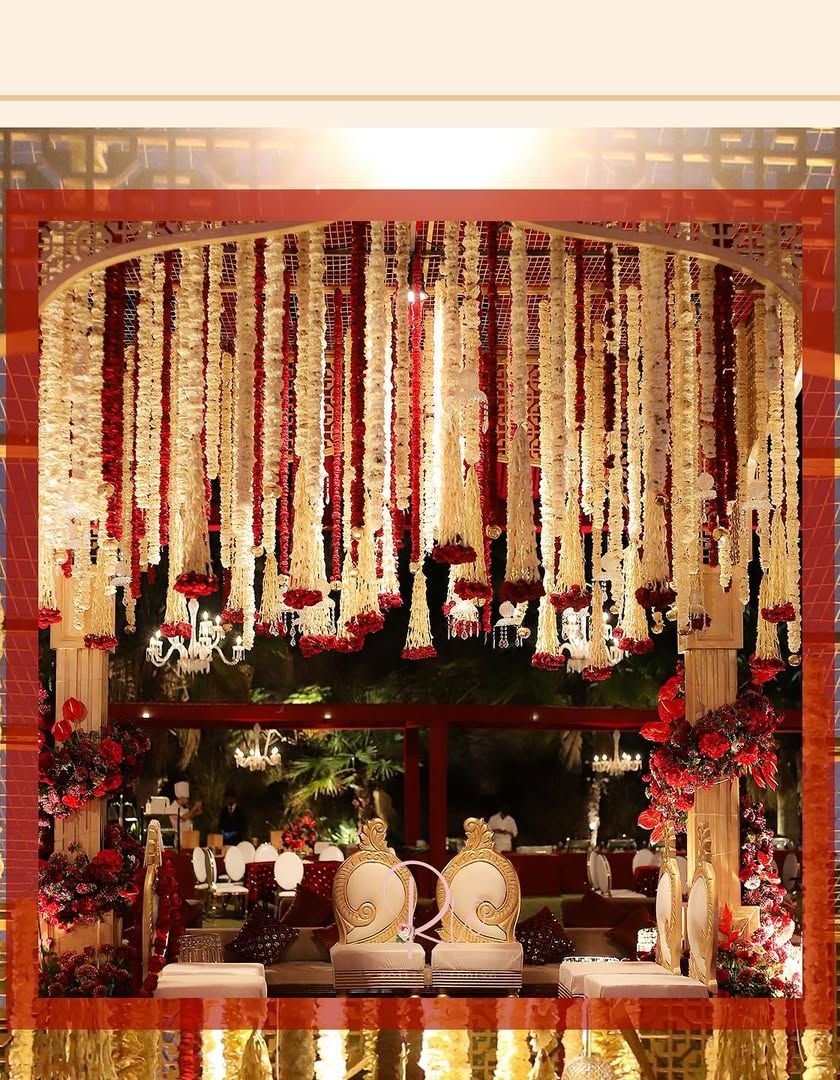 I design mandaps that feel both grand and deeply personal, drawing from India's rich heritage. This includes classic red and rajnigandha floral ceilings for a royal feel, and elegant ivory and mogra setups for a touch of timeless grace.