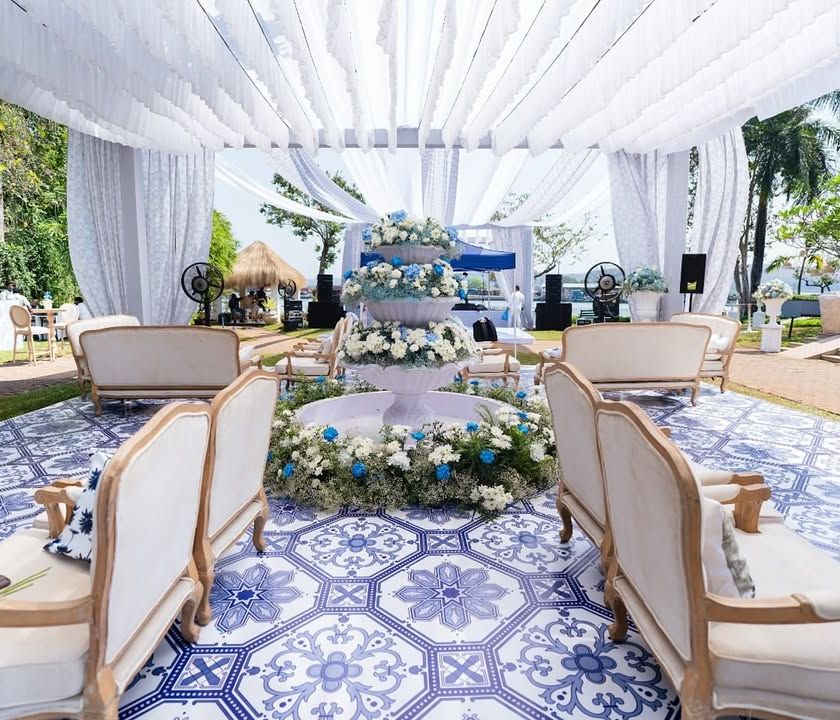 For a light and breezy celebration, I create designs inspired by European elegance, like a French Riviera carnival. These events feature palettes of powder blue and white, custom-tiled floors, floral fountains, and whimsical details for a sophisticated daytime affair.