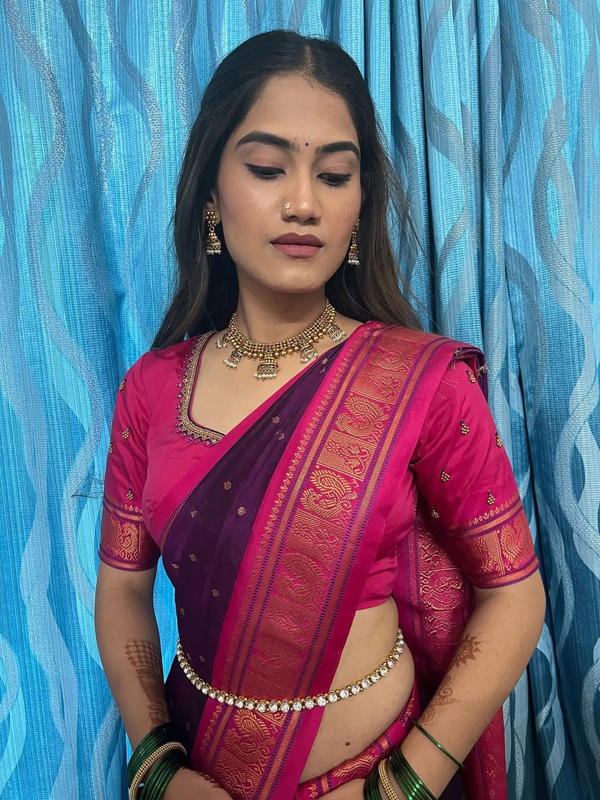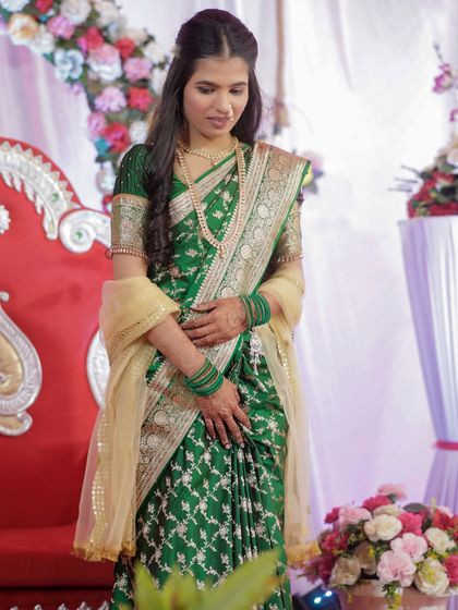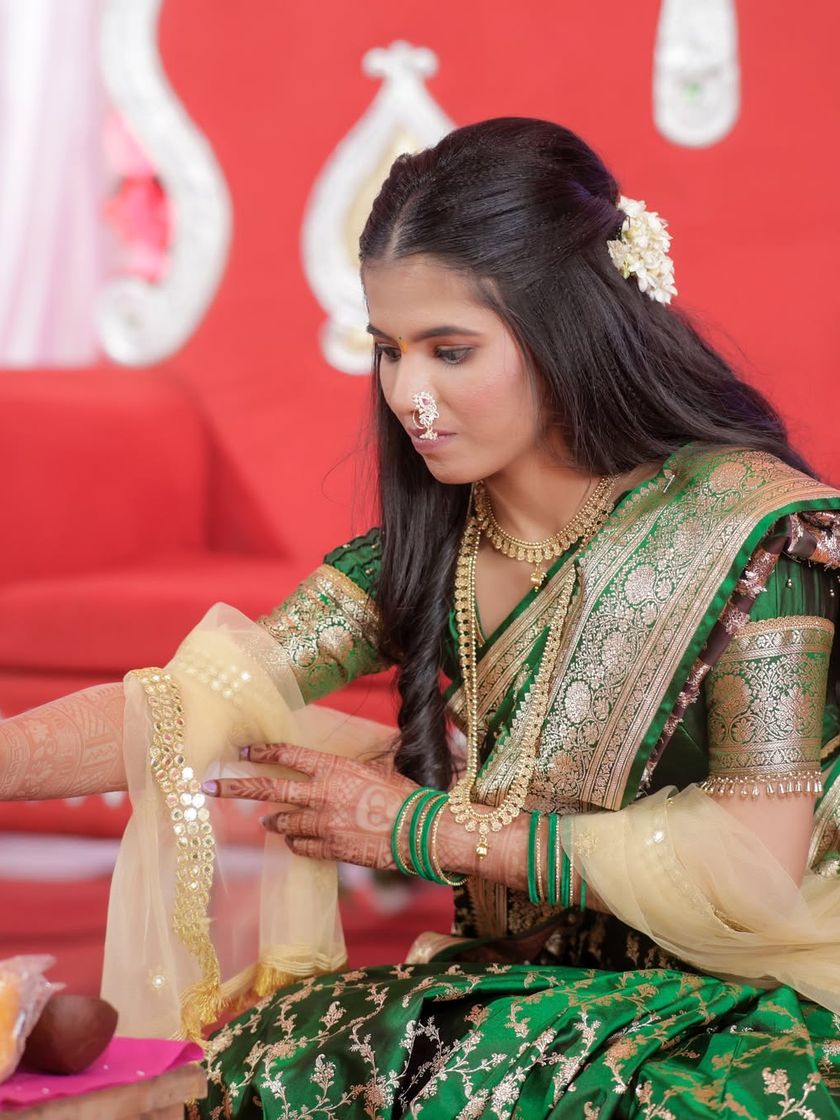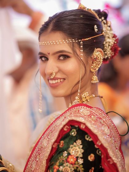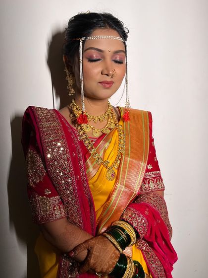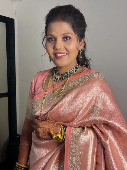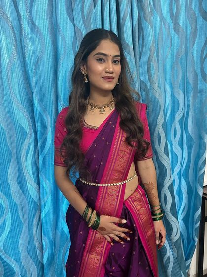 This is my specialty and passion. I provide a complete service that includes traditional makeup, perfecting the Paithani or Nauvari saree draping, and styling with the nath, mundavalya, and a floral Khopa bun.
