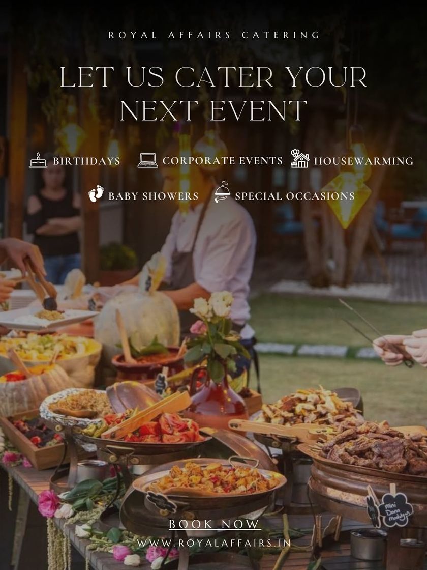 I design grand buffet experiences that give your event a truly royal feel. My setups feature elegant brass and gold chafing dishes, and the menu can be customized with a mix of Indian, international, and fusion main courses to satisfy every guest.
