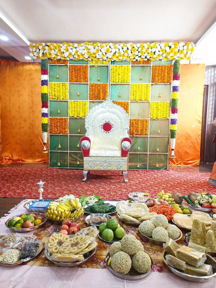 For the mom-to-be, I design stunning, traditional setups rich with flowers like marigold and jasmine, and classic banana leaf backdrops. I make sure she feels like a queen on her special day.