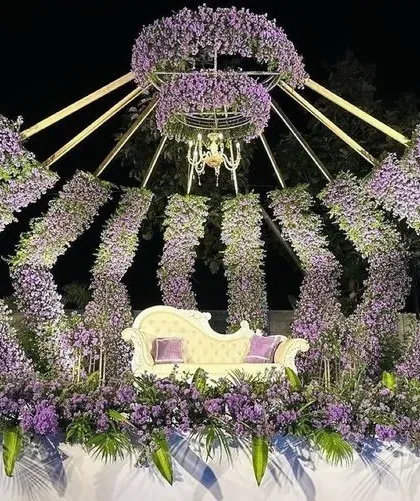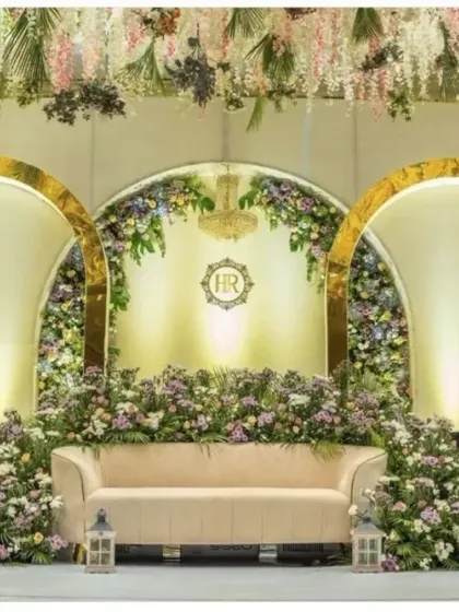 - Backdrop: A massive, wall-to-wall floral installation (premium silk flowers mixed with fresh fillers) or a Royal Palace theme with fiber pillars.