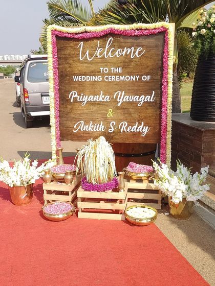 - Welcome Board: A customized easel stand with a Welcome board adorned with a floral bunch.