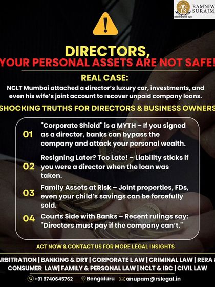 If an IBC notice lands, I don’t let panic take over. I push back on wrongful insolvency claims and help draft resolution plans that keep your reputation and assets safe. For personal guarantors, I explain what’s actually at risk - ghar, investments, future earnings, nothing hidden.