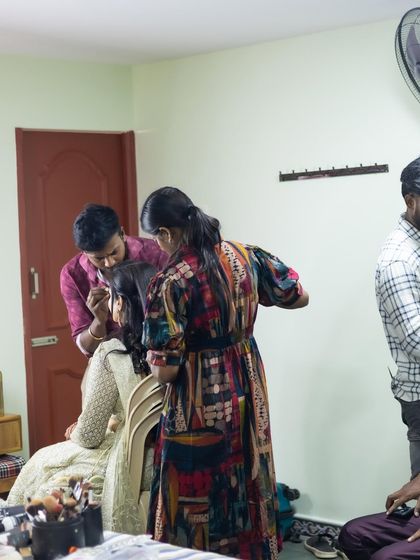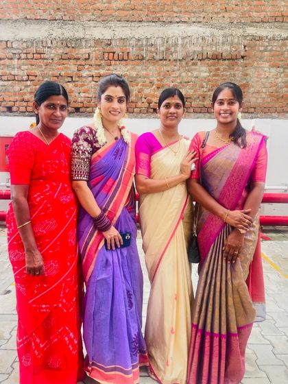 Hey, naan Soundarya. Saree-na, not just dress pa, it's a whole vibe. I get super emotional seeing those Appa Love moments, especially with my brides. Oru ponnu-ku wedding day is big, and making her look stunning in her saree - that's my joy. I've draped sarees for ladies from Japan, England... their excitement for our culture, adhu romba sandhosham-a irukum (makes me so happy). When I'm free, I'm with my kids or ogling sarees at a family wedding! Teaching saree draping is my passion too. I want to share this art, my love.