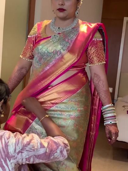 The Muhurtham ceremony is the heart of the wedding, and the bridal saree is its centerpiece. I specialize in draping heavy Kanchipuram silks, ensuring the pleats are sharp and the fit is secure, so you can move through your rituals with confidence and grace.