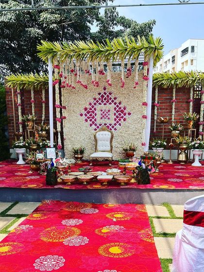- Entrance: Traditional floral arch using Marigold and Mango leaves with a 3ft floral rangoli (rose petals/chrysanthemums).