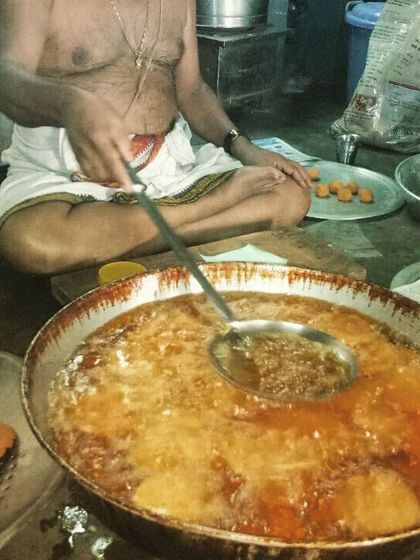 Namskara! We’re RVR Foods Iyengars. Started by my appa, Ranganath Iyengar, in 1986 as RR Caterers. Now, it’s on me to keep his legacy alive. Our team is family – Shankarnna, Rajanna, Holige Raganna – all legends in their own way. For us, food is heart work. Before every big oota (meal), we pray, 'Annapoorne sadaa poorne... devare, illi oota maadoru arogya vruddhi aagali.' That’s our wish for everyone.