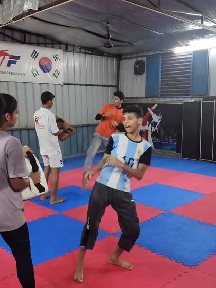 This is where we refine our weapons. I conduct numerous partner drills with kicking pads and targets to perfect technique, increase kicking power, and improve accuracy for scoring points in competition.