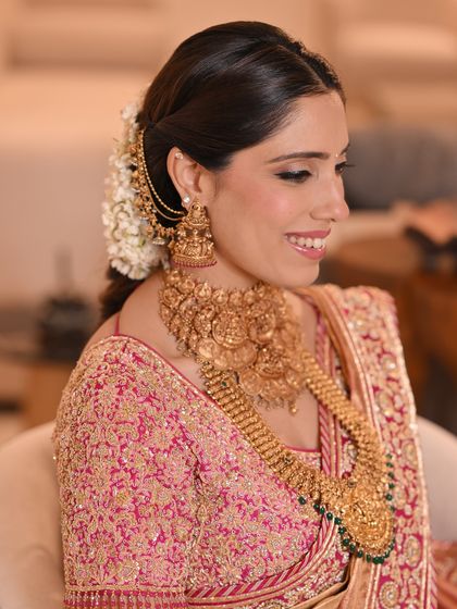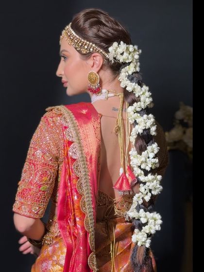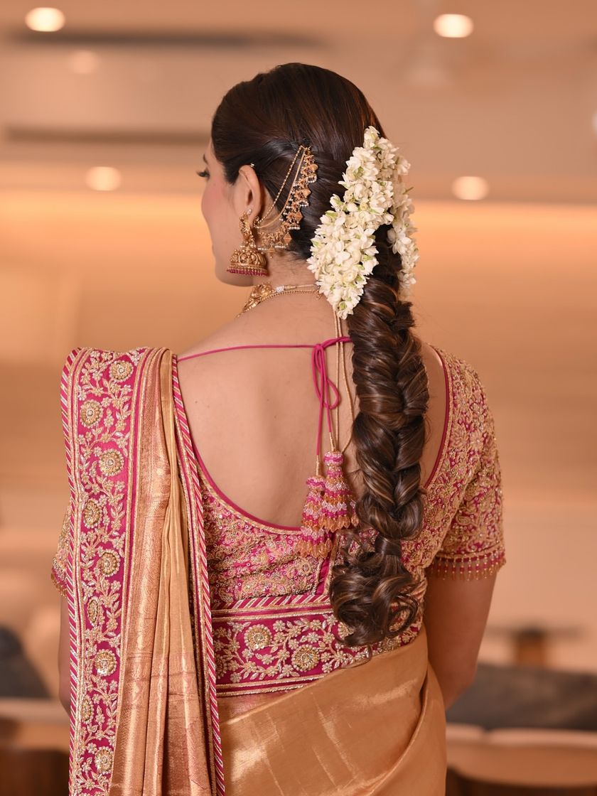 For the main ceremony, nothing is more classic than an elegant bridal bun. I specialize in creating a variety of updos, from sleek and polished buns adorned with traditional mathapattis to soft, romantic buns woven with fresh flowers, ensuring your look is secure, comfortable, and absolutely regal.