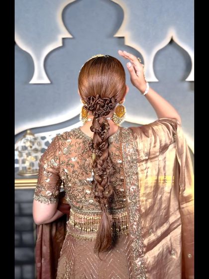 Braids and ponytails are a versatile and stylish choice for any wedding event, especially for a Mehendi or Sangeet. I design everything from sleek, high ponytails for a modern cocktail look to intricate, traditional braids adorned with parandis, flowers, or unique accessories for a more classic feel.