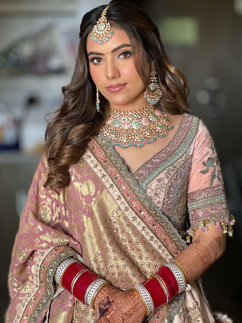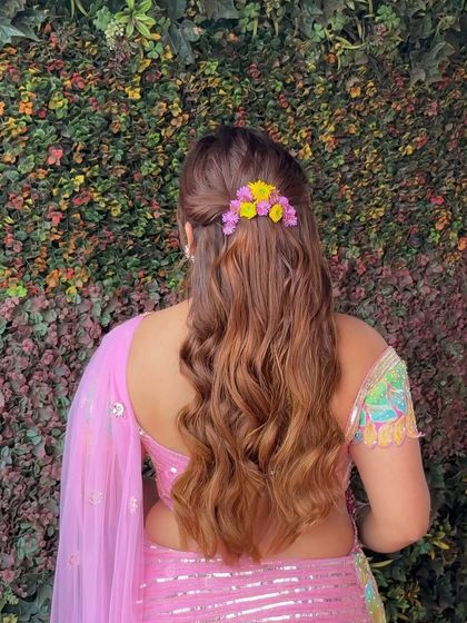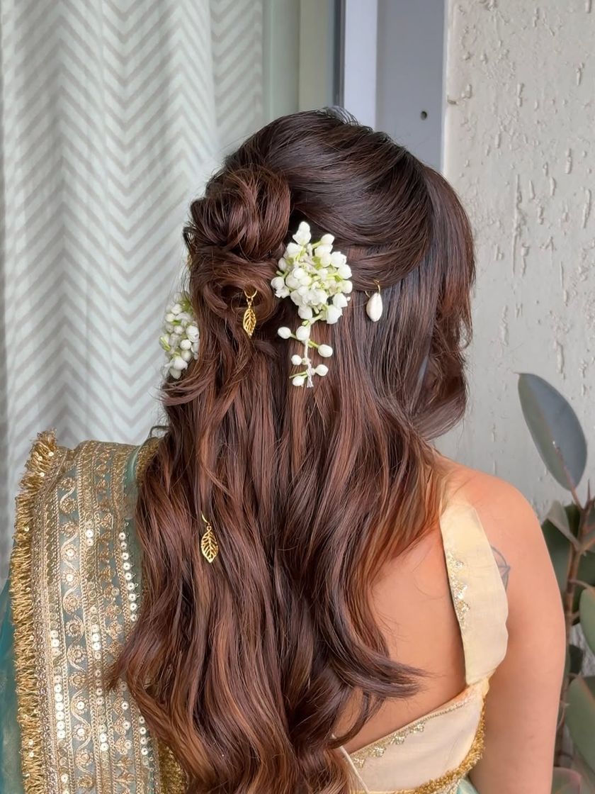This is one of my most requested styles, perfect for anything from a Sangeet to a cocktail party. I specialize in creating soft, bouncy waves and elegant half-updos, often weaving in braids, twists, or delicate accessories like pearls and flowers for a dreamy finish.