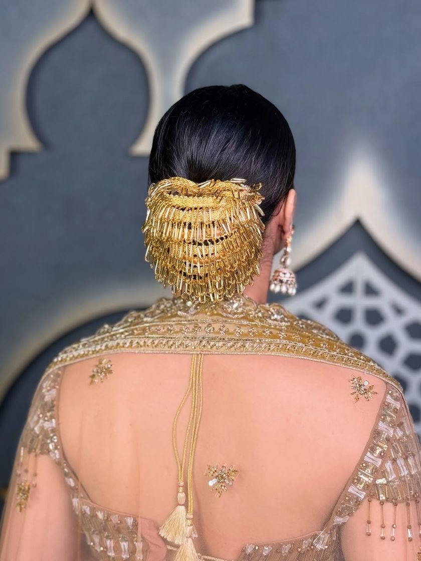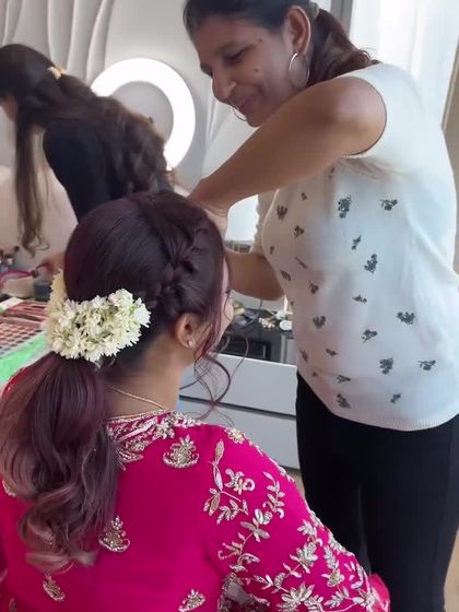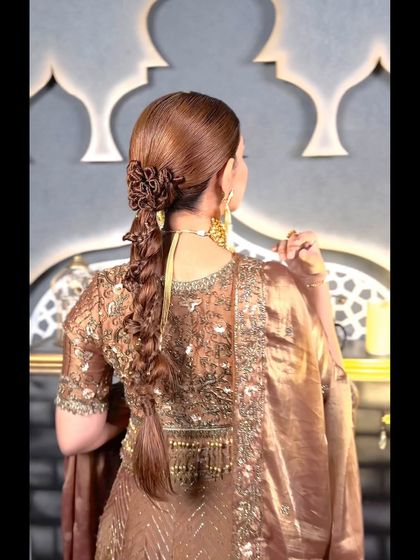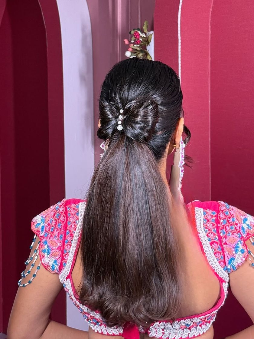 From sleek, high-shine "Barbie" ponytails to textured, wavy styles perfect for a party, I can create a modern look for any event. These styles are great for dancing the night away at a Sangeet or making a statement at a cocktail party, often finished with intricate wraps or accessories.