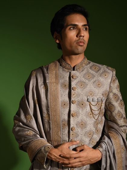 Couples and wedding parties seeking premium customized wedding attire, particularly those who appreciate detailed handwork and traditional Indian craftsmanship with a modern twist.