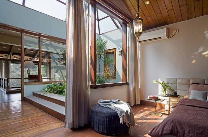 This project, 'Aangan' (The Courtyard House), is the heart of my design philosophy. I designed it as an inward-looking sanctuary that brings peace and privacy, with rooms opening onto internal courtyards to keep nature close. The design uses locally sourced timber, salvaged stone, and large glass windows to create a warm, biophilic environment that blurs the line between indoors and out.