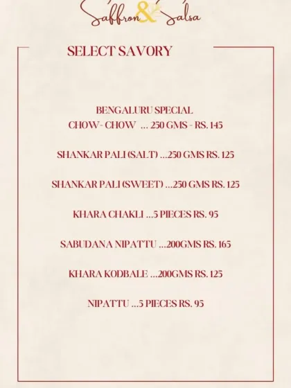 - Bengaluru specials: Chow-Chow, Khara Chakli, Kodubale, Shankar Pali, classic Nipattu