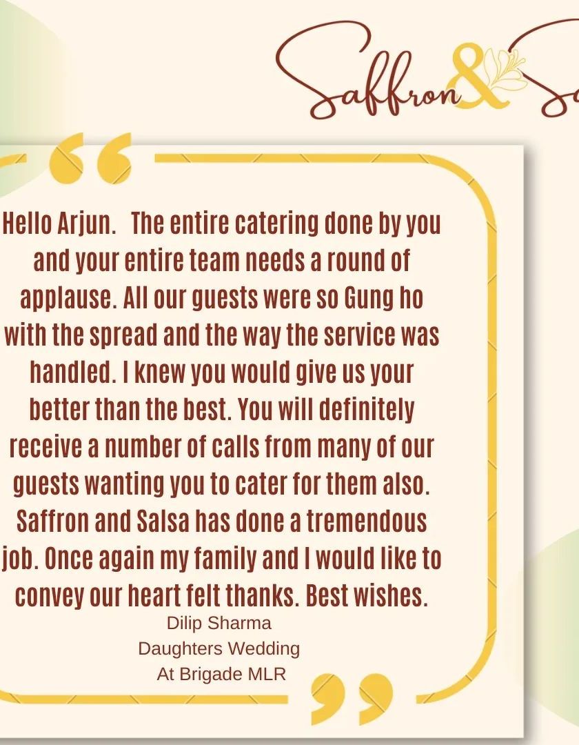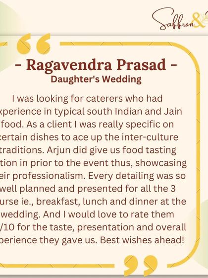 'Yatha Annam Tatha Mannam' guides our work. I believe cooking is meditation, and every menu should be a personal story. We are committed to conscious catering, focusing on zero food waste, avoiding single-use plastics, and creating a customized menu that reflects your culture and traditions.
