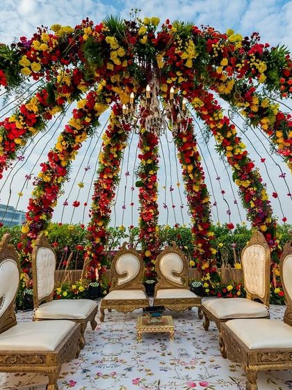 - Receptions: Flower tunnels, jaali (latticework) backdrops, dramatic stages, and overhead florals for your big party.