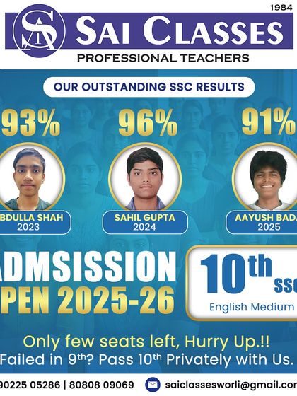 We teach grades 5-10 (SSC and CBSE, English medium) in small batches with concept-based learning, regular tests, career counseling, and extra help for students who need to clear 10th privately.