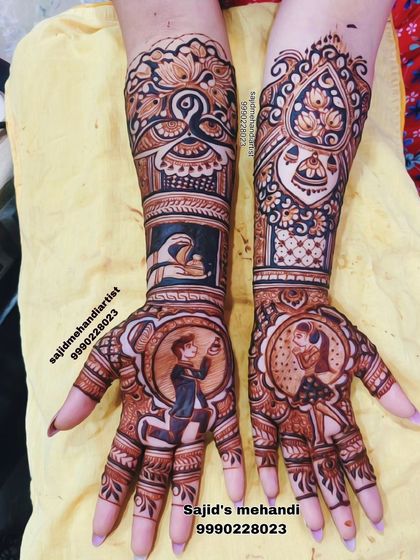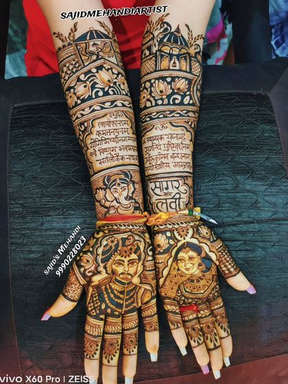 I create custom bridal mehandi with real bride and groom portraits, personal motifs, and guarantee the exact design you see, plus I travel anywhere for your wedding.