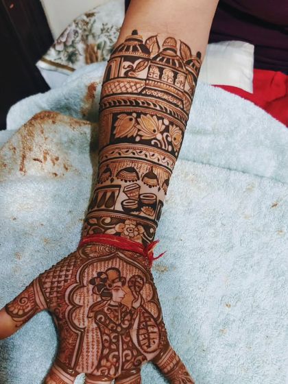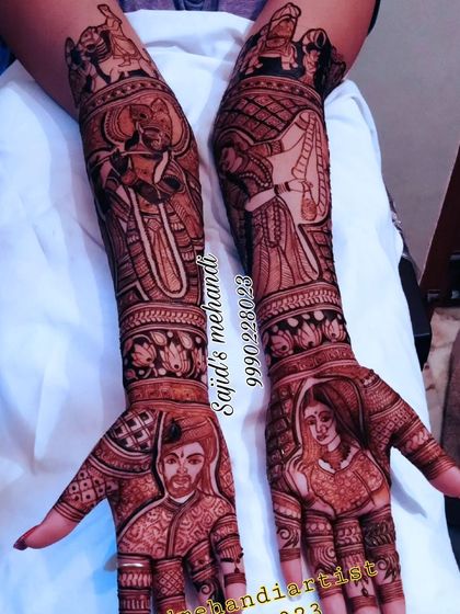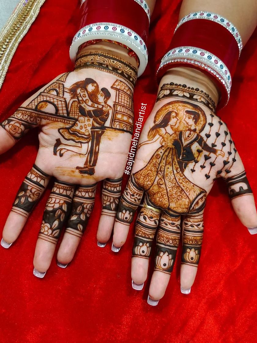 This is my specialty. I create realistic, detailed portraits of the bride and groom, capturing their likeness in henna to make your design truly one-of-a-kind. Each portrait is drawn with precision and care, becoming the heart of your bridal mehandi.