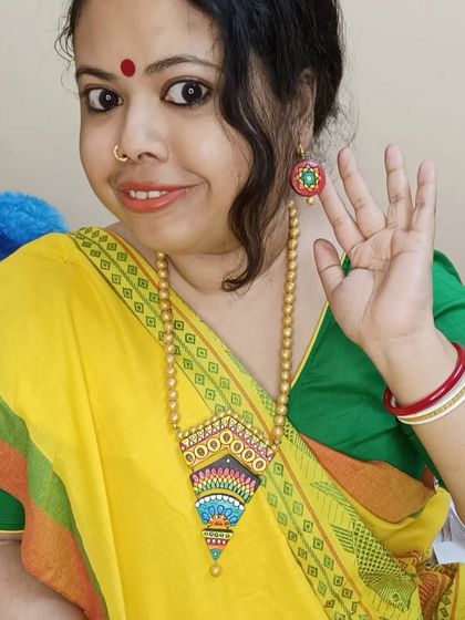Hey, I’m Sajjita. My hands are always messy with clay and paint - that’s how I like it. I only make terracotta jewellery, all hand-painted, all inspired by Indian art. Sometimes I’ll paint a Jamini Roy face, sometimes a Rajasthani dancer, sometimes Bengal’s alpona. These aren’t just ornaments, they’re little stories. Wearing my pieces, I want you to feel ‘main apni favourite hu’ (I am my own favorite). It’s all eco-friendly, baked clay, and full of heart.