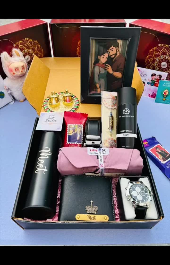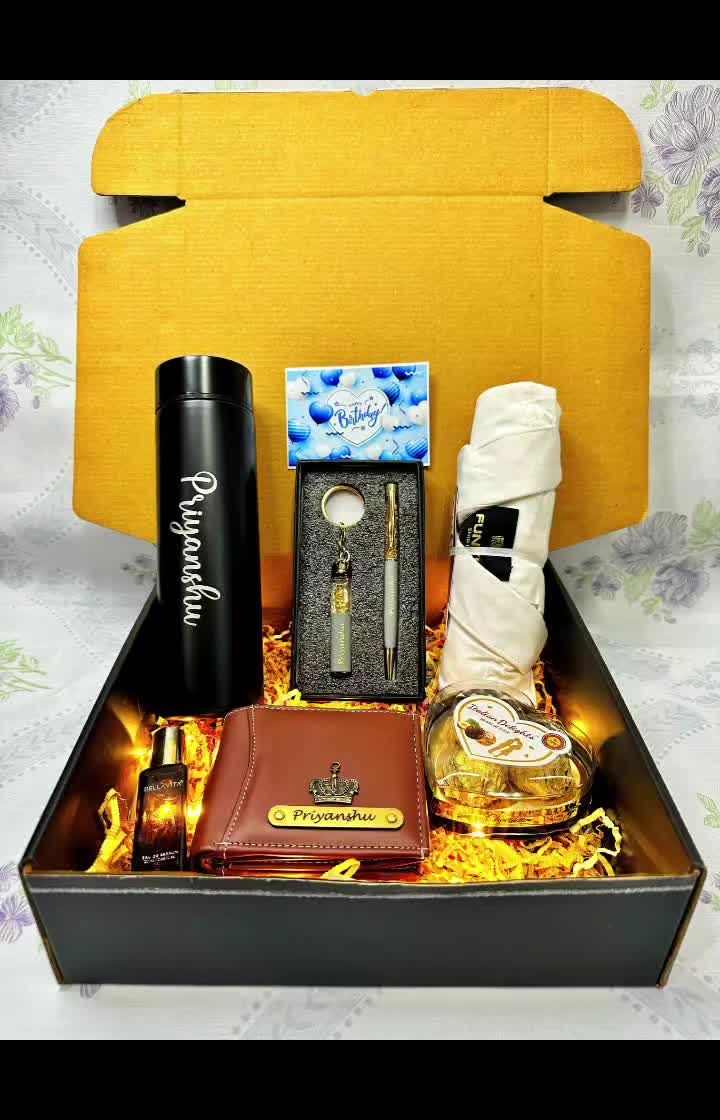 I design complete gift sets for any occasion, packed with personalized items. You can find hampers for men and women, with options including wallets, bottles, mugs, perfumes, and more, all beautifully arranged in a gift box.