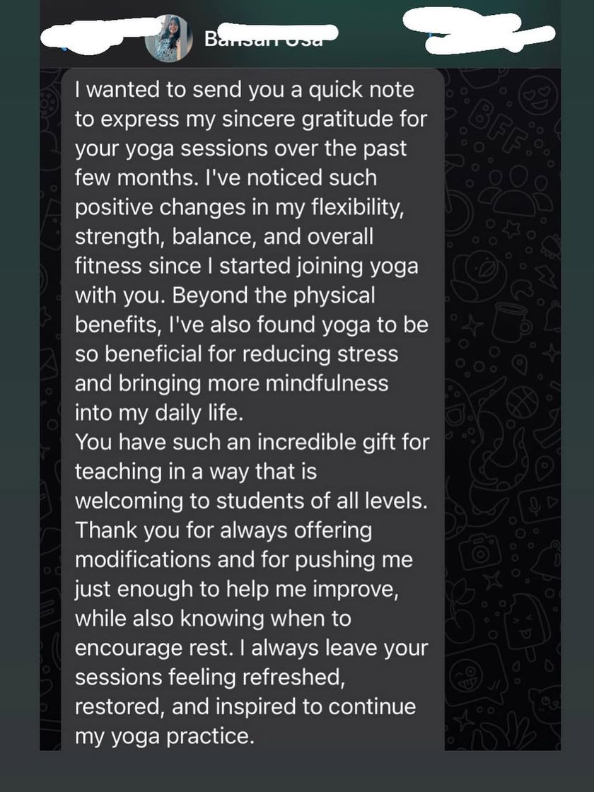 Nothing makes me happier than seeing my students feel better in their own bodies. Here are a few words from the wonderful people I've had the privilege to guide on their yoga journey. Their progress is my biggest motivation.