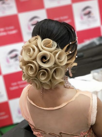 I am known for my detailed and secure updos that look like works of art. This gallery shows a variety of styles, including classic rose buns, complex woven patterns, and modern updos, often decorated with flowers or pearls.