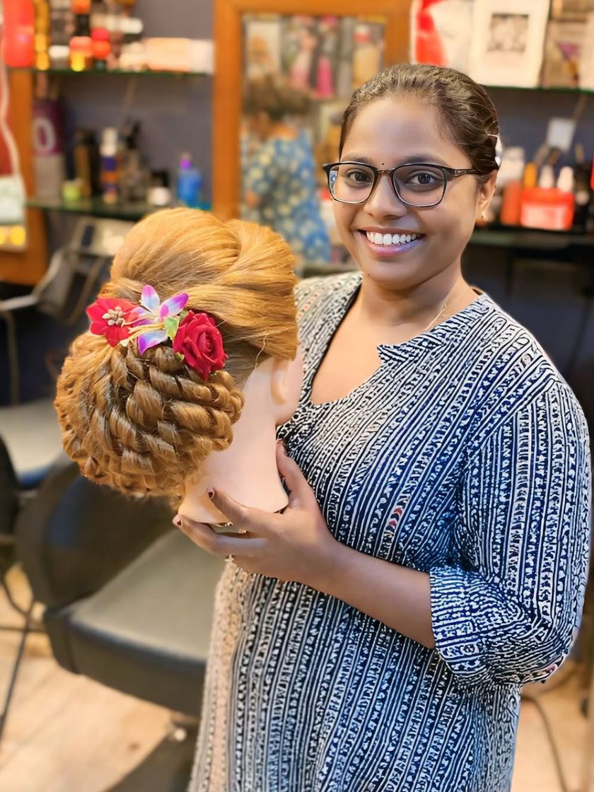 This is where you learn the most in-demand skills for any hairstylist. I teach everything from traditional Indian bridal updos and modern reception looks to elegant open-hair styles with curls and waves, ensuring you can cater to any client's needs.