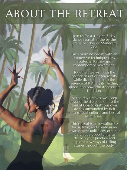 Here are the details for our upcoming 4-night, 5-day dance retreat in Goa. This journey will blend Kathak and contemporary movement with the soul of Goa, including beachside dancing, local cooking classes, and pottery workshops.
