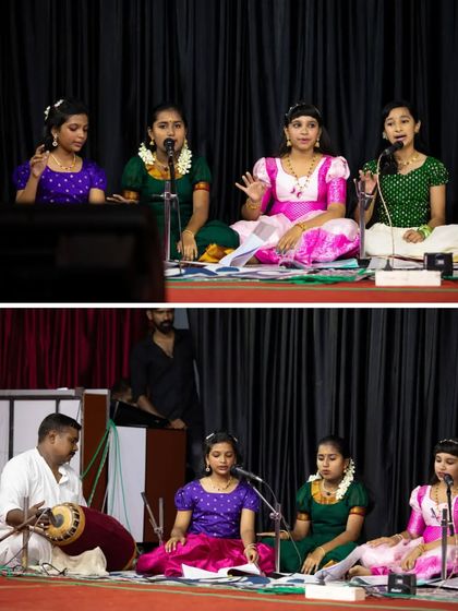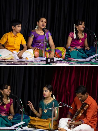 We teach Carnatic vocal music with live accompaniments, blend music and dance, and give everyone regular stage experience in a friendly, informal setting.