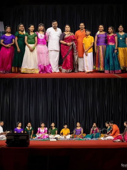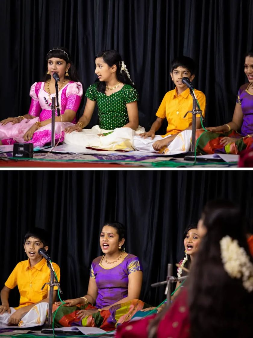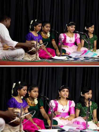 Our program for children is designed to be fun, not formal. We use games and energetic sessions to teach beginner Carnatic singing lessons, helping kids find their voice and confidence. This cluster shows our young students during their first stage performances, many singing with live accompaniments for the very first time.