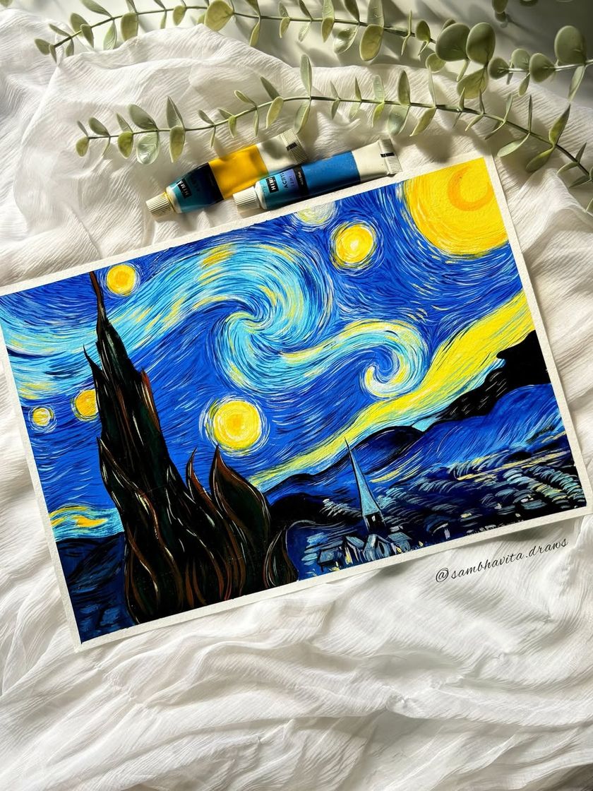 Sometimes I love to challenge myself by recreating famous masterpieces or painting realistic still life objects. This section includes my take on Van Gogh's "Starry Night" and detailed studies of things like food and religious figures. It's a great way for me to practice and show my technical skill.