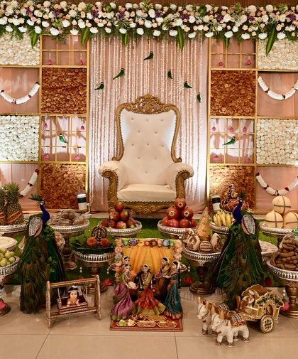 - At home, our most asked-for decor is for housewarmings. Expect a banana leaf entrance arch (Chappra), floral garland decorations (thorans) for main doors and pooja rooms, and a simple, beautiful altar setup.
