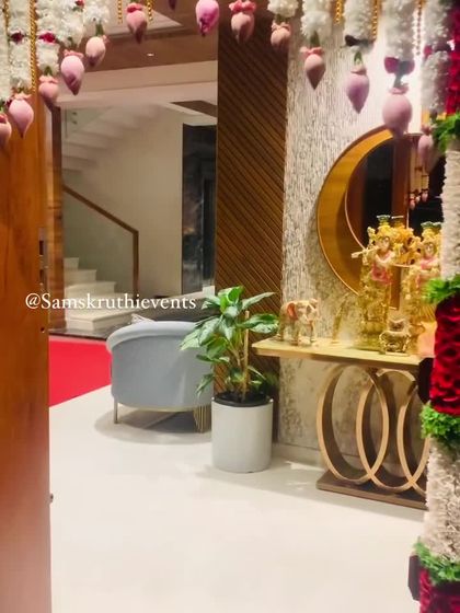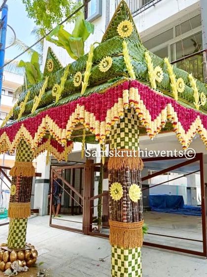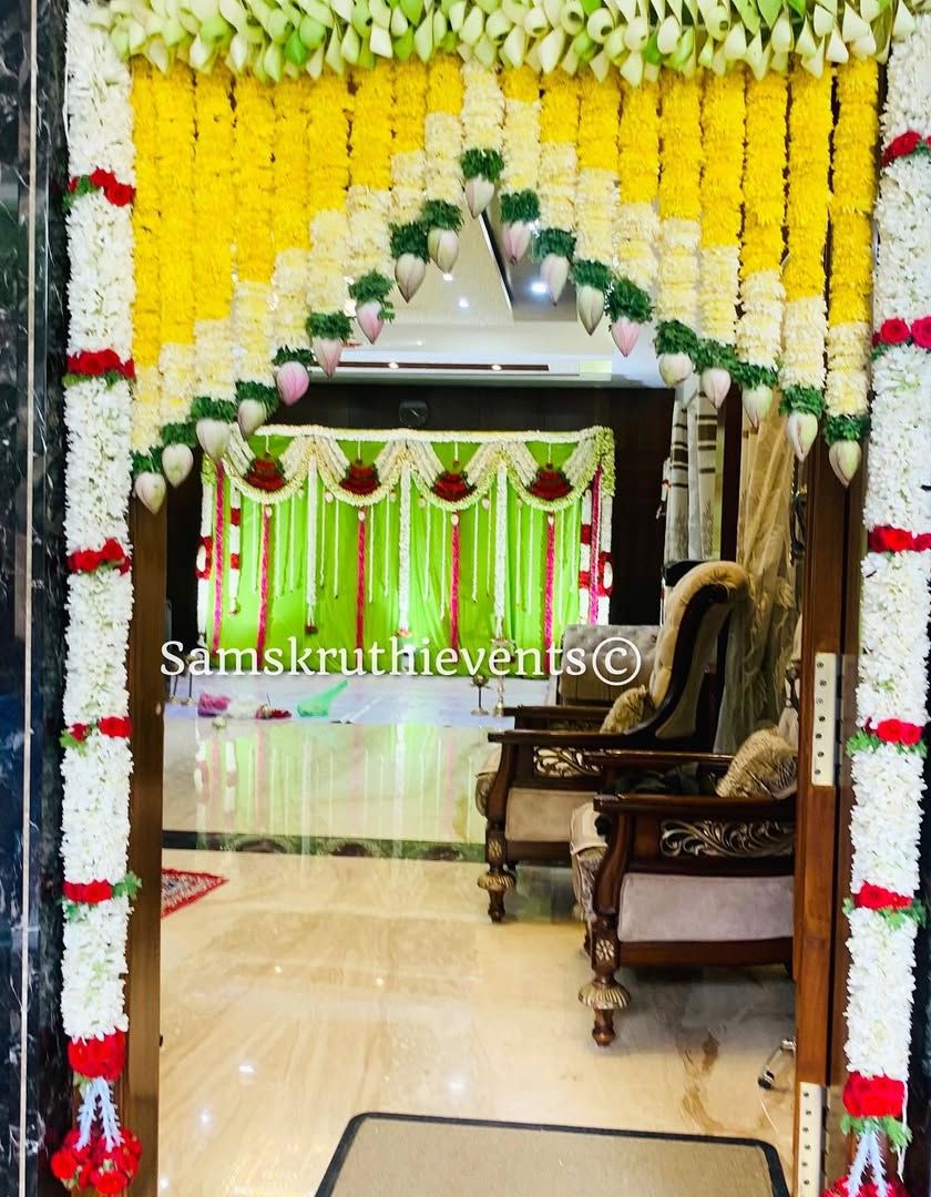 We create beautiful first impressions with traditional entrance decor. This includes grand Chappra arches made from banana leaves and intricate floral thorans for main doors and pooja rooms.