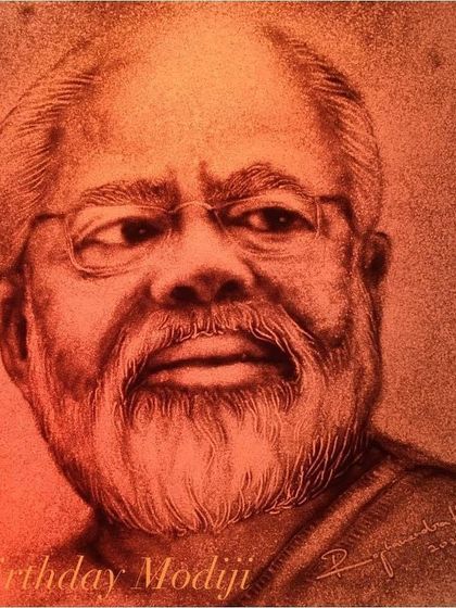 I express my love for the nation through sand art, creating pieces for national events and as a tribute to our freedom fighters. These works capture the spirit of 'Mera Bharat Mahaan' using sand as the medium.