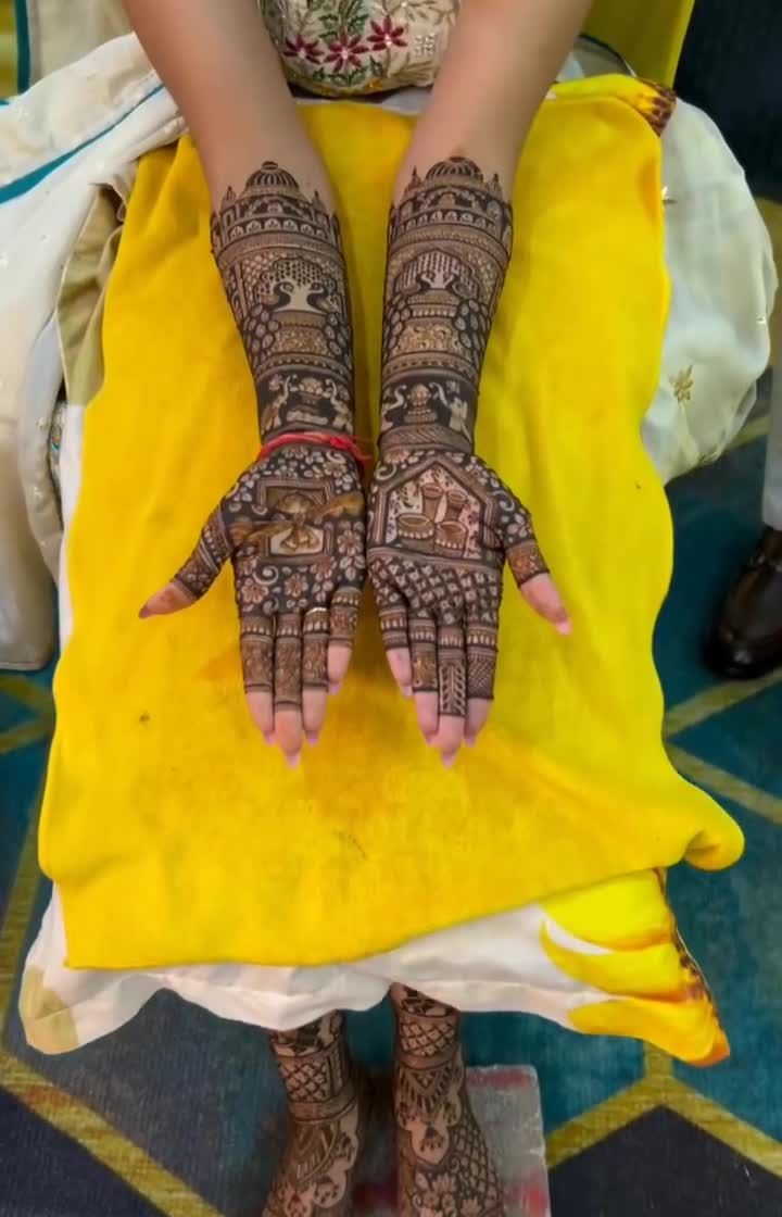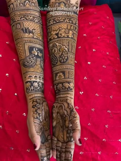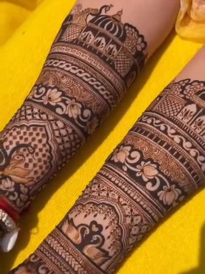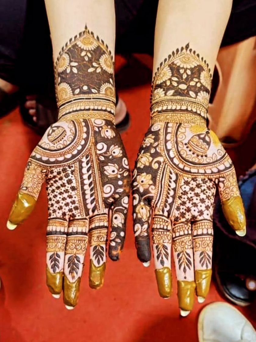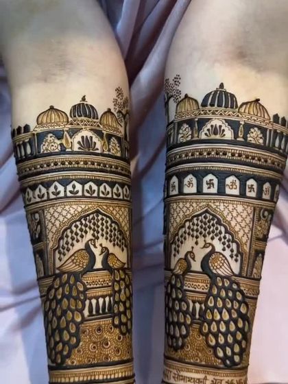 I create intricate and traditional Rajasthani mehndi filled with classic motifs that celebrate our heritage. These designs feature detailed peacocks, majestic elephants, lotus flowers, and palace-inspired architecture for a truly royal bridal look.